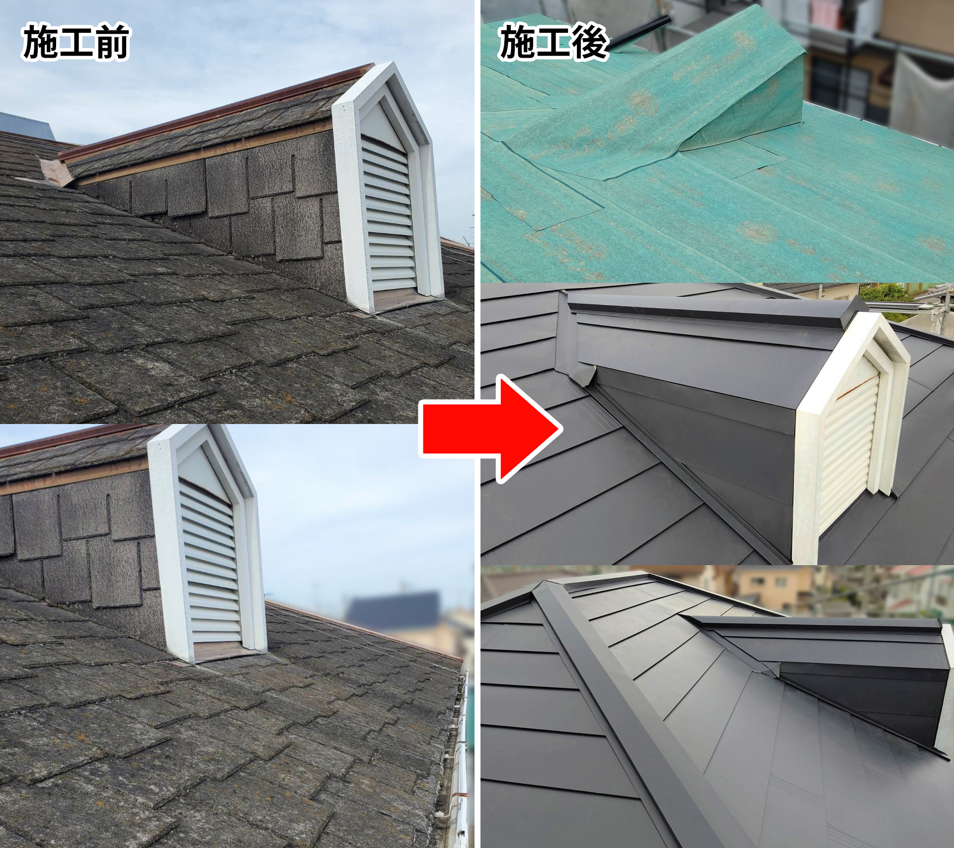 Works屋根工事 施工実績 屋根改修工事 元の屋根瓦(カラーベスト)の上に、防水ルーフィングを施し、新たに屋根を葺きました。この工法は工期が短く費用も安価です。 大規模施工 元のスレート(黄色)の上に、新たに板金カバールーフ(青色)を施工しました。この工法は工期が短く費用も安価です。